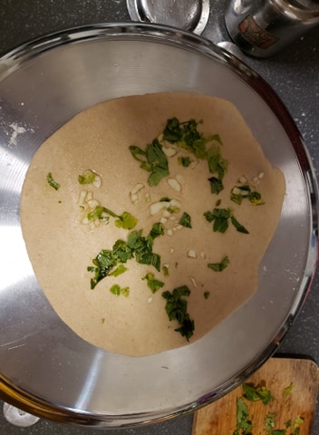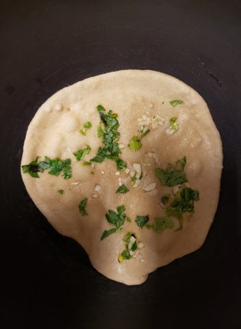 4. Grease the top portion of the roti with oil and garnish with finely chopped coriander leaves and garlic. This step is optional.