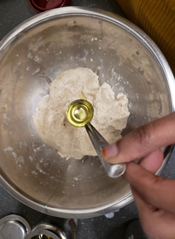 2. Add curd and start kneading the dough by adding water little by little. Add 1tsp oil and knead to make a soft dough. Cover and set aside the dough for 45minutes.
