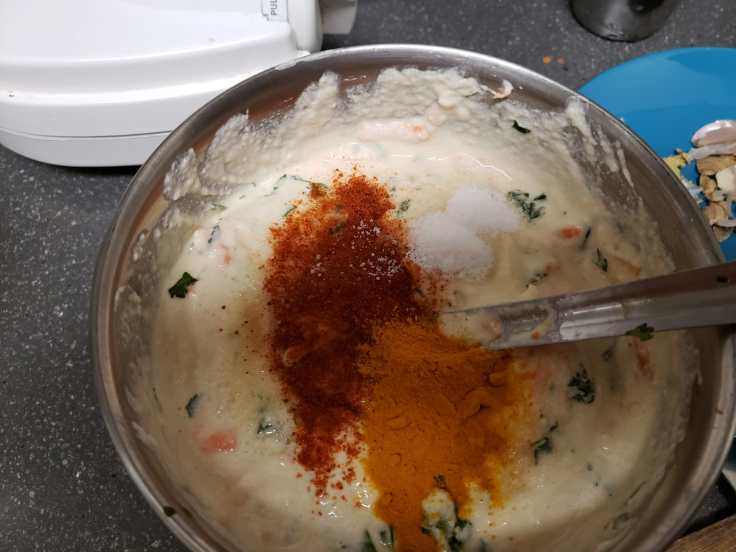 - Transfer batter to a bowl and add carrot, coriander leaves, curry leaves, salt, sugar, turmeric powder, ginger garlic chili paste, red chili powder, oil and mix well.