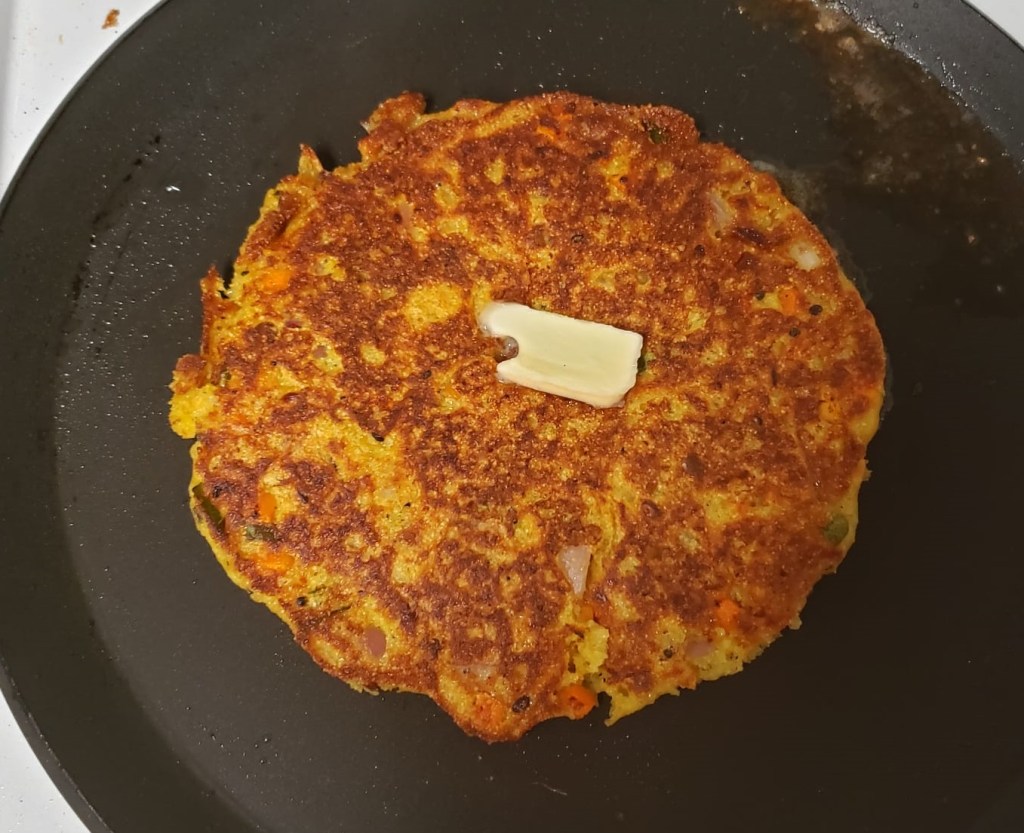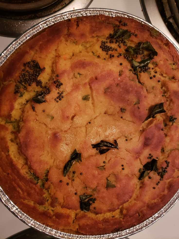 - Make thin handvo on pan, so that it gets completely and uniformly cooked.